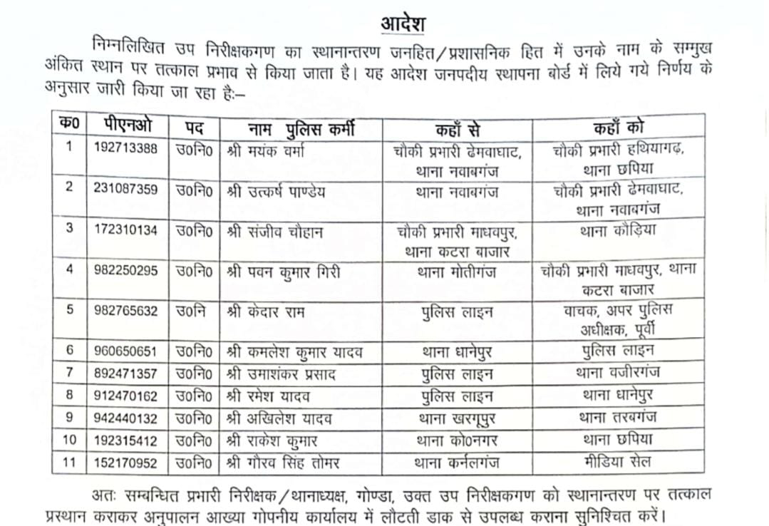 गोण्डा - कानून व्यवस्था को देखते हुए प्रशासनिक हित में जनपद में नियुक्त निम्नलिखित उ0नि0गण का स्थानांतरण किया गया है। स्थानांतरण सूची निम्नवत है।